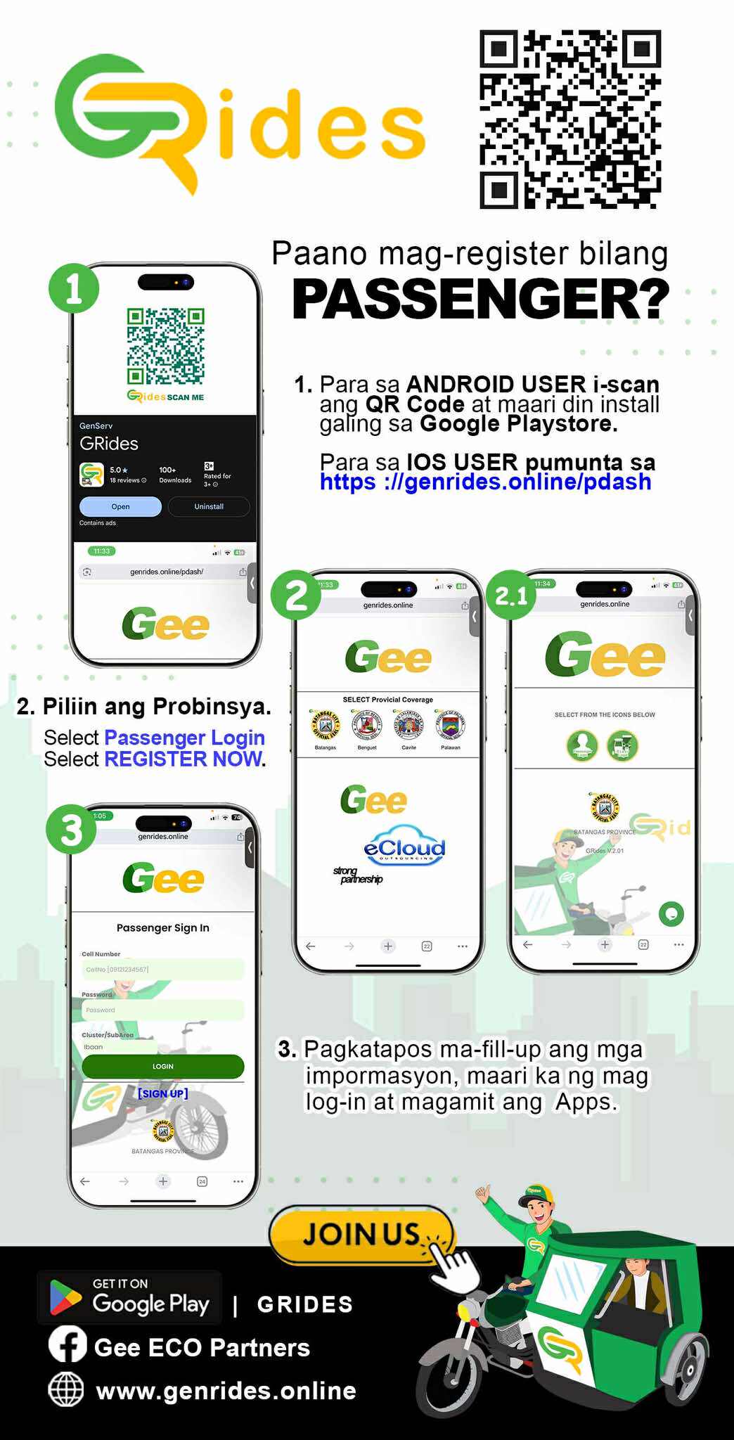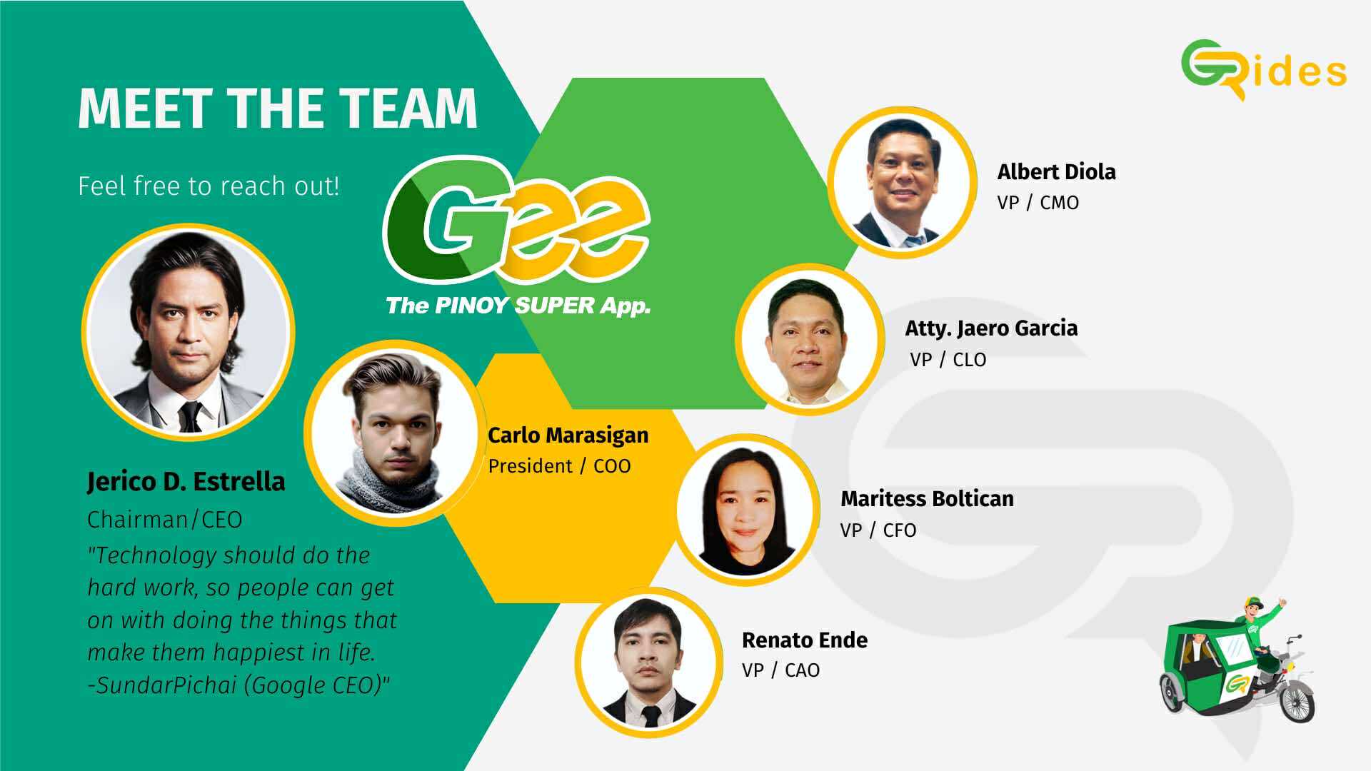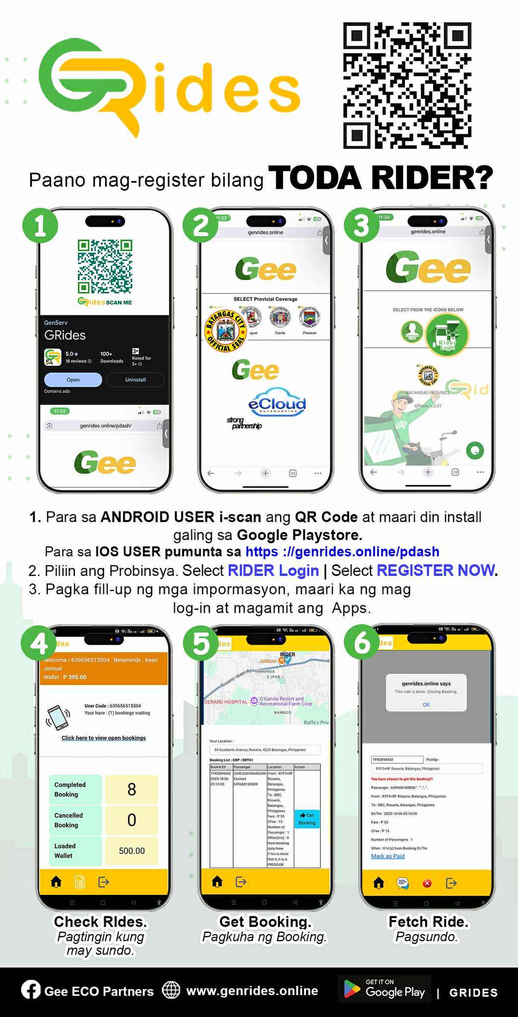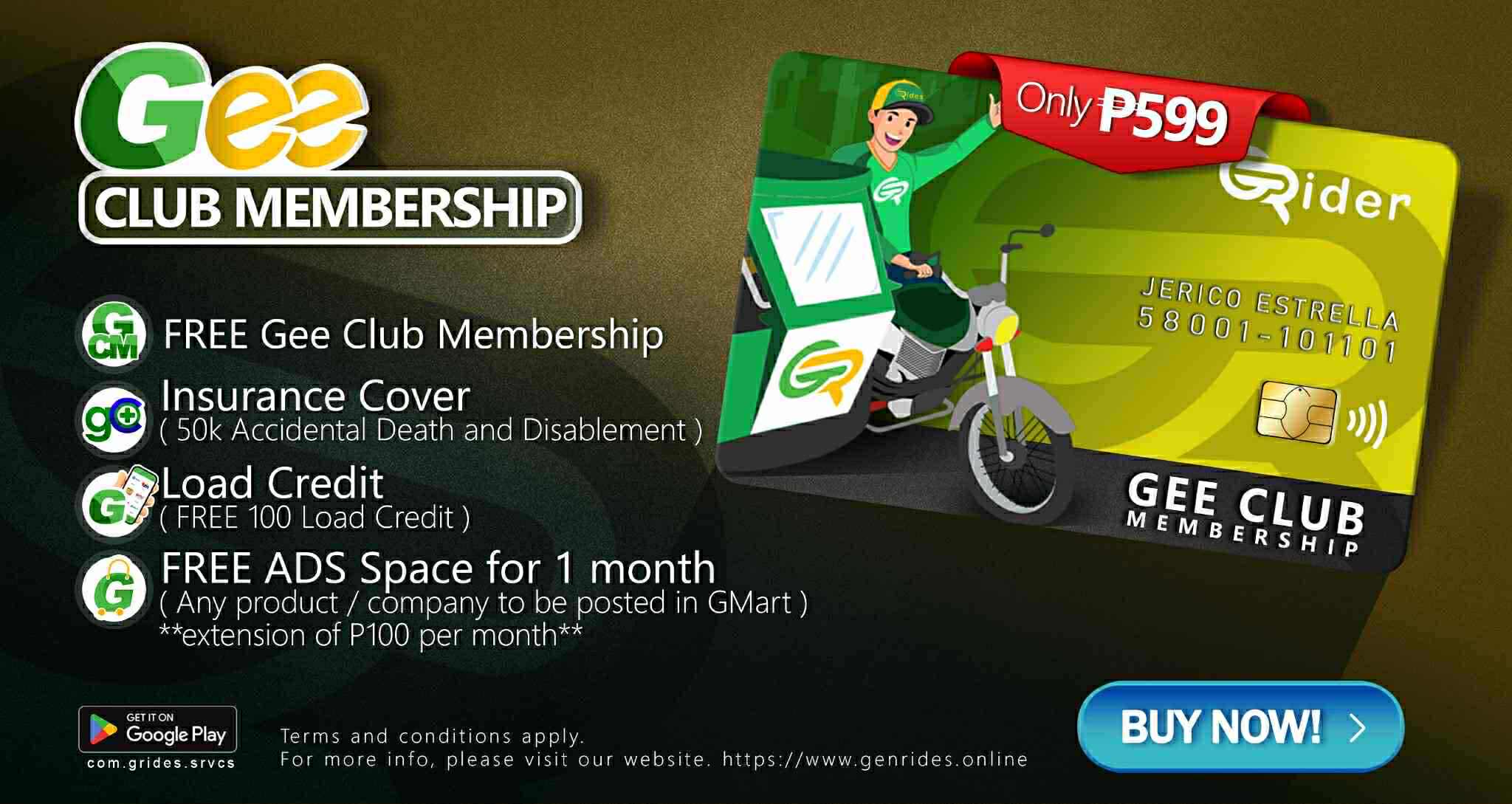What is Gee/ or GRides? - Is a service provider company. Gee offers the following services. A system that facilitates booking, and delivery and records them and charges the corresponding convenience fee. A membership club that gives benefits like insurance protection, specializing on TODA needs, GRides also caters to single motor and four wheels as a system provider.